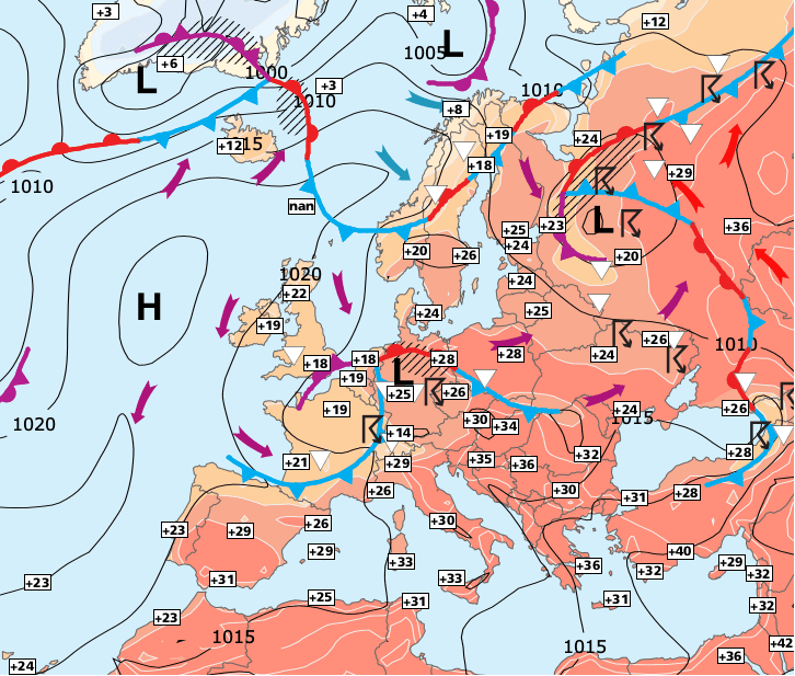 + Puis l’air océanique moins chaud et plus humide qui envahira à la France par l’Ouest, occasionnant une dégradation orageuse le week-end prochain - mais la baisse des températures devraient rester assez limitées, notamment près de la Méditerranée où les fortes chaleurs auront même tendance à s’accentuer de jour en jour !