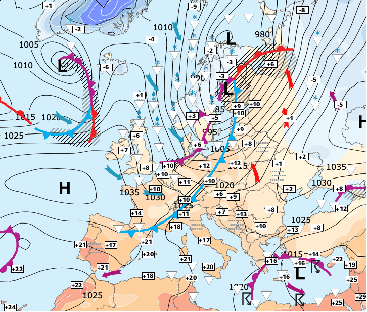 + Ces hautes pressions bloqueront l’air froid au niveau du sol sur un grand quart Nord-est jusqu’à mardi.