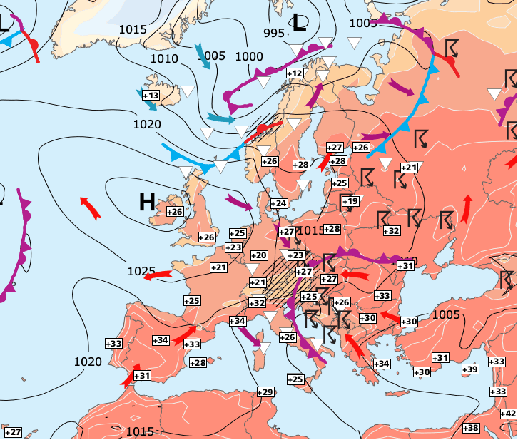 Noms des dépressions et anticyclones prévus pour dimanche 18 juillet 2021 à midi (Berlin)