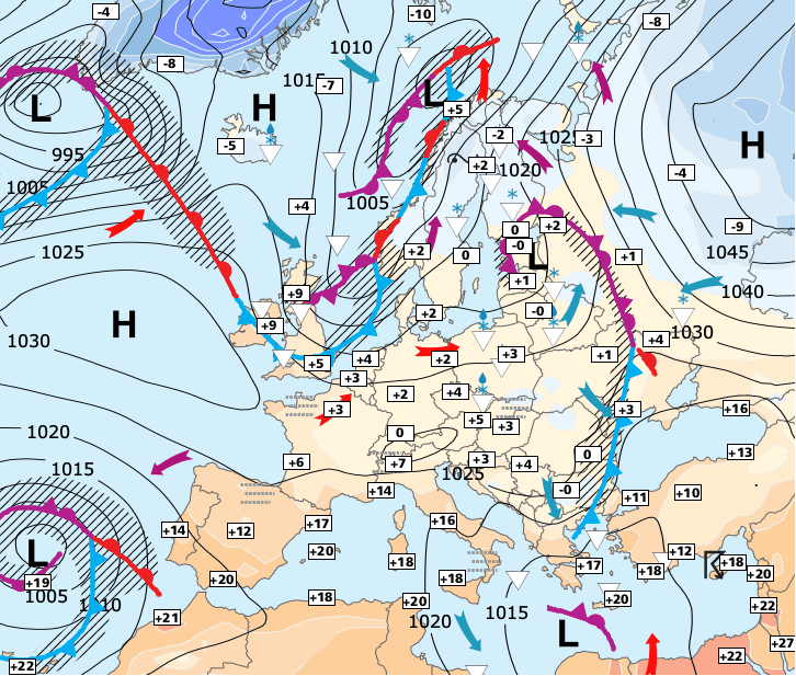 Noms des dépressions et anticyclones prévus pour mardi 1er décembre 2020 à midi (Berlin)