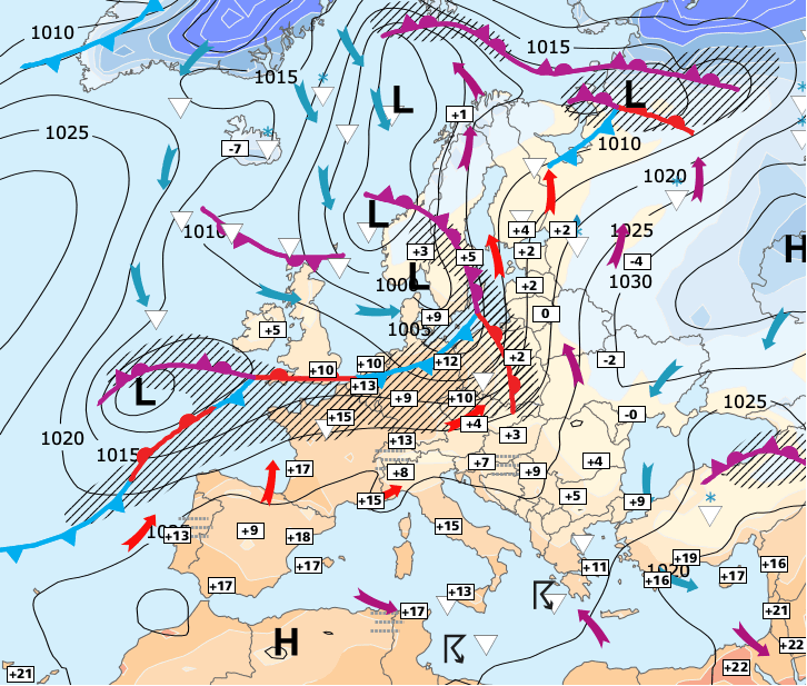+ La moitié Nord reste sous les nuages et quelques pluie (en limite de l’air plus froid qui intéresse déjà l’Europe du Nord).