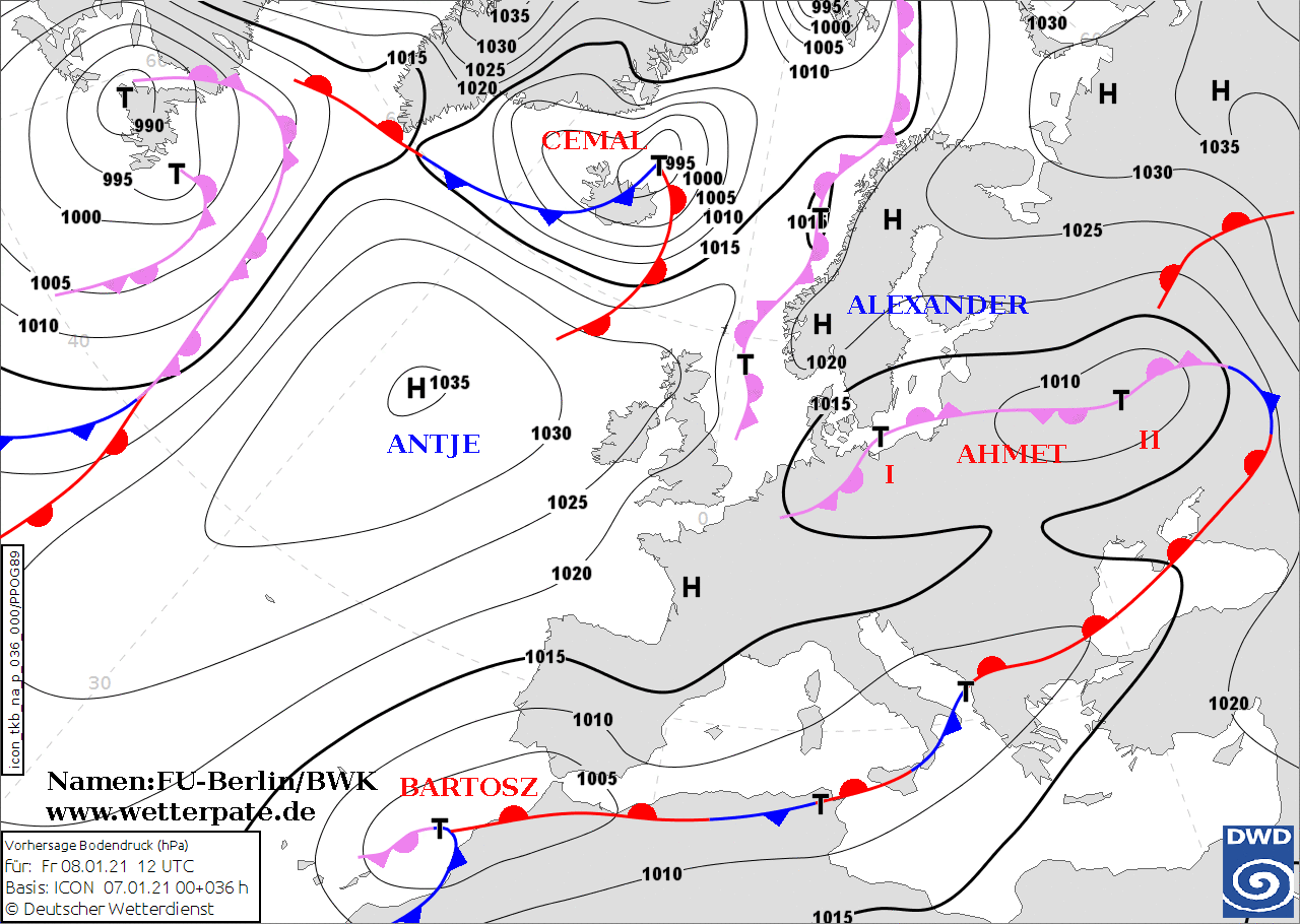 Noms des dépressions et anticyclones prévus pour vendredi 8 janvier 2021 à midi (Berlin)
