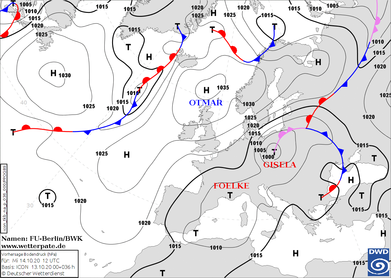 Noms des dépressions et anticyclones prévus pour mercredi 14 octobre 2020 à midi (Berlin)