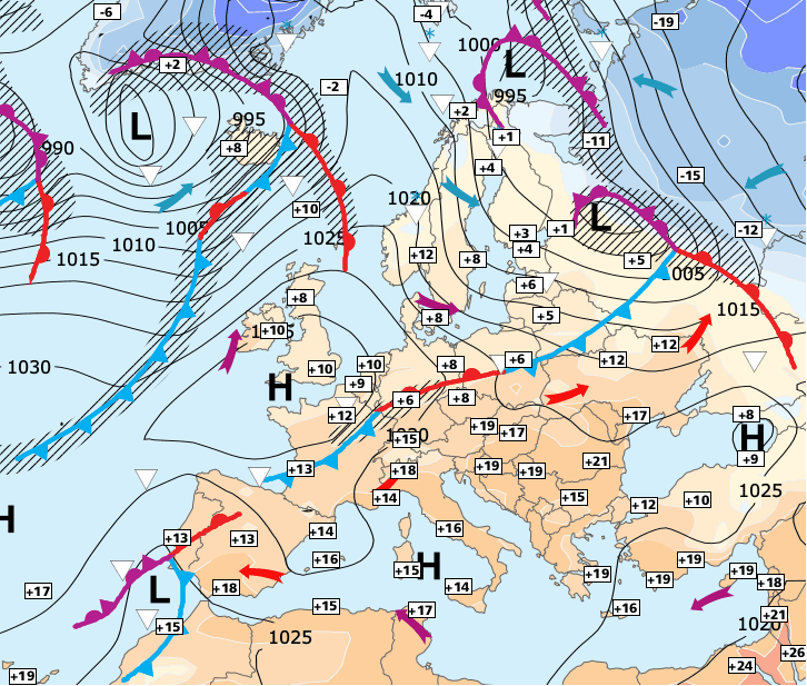 + La petite dépression d’altitude qui s’est faufilée sur le Nord-est a occasionné quelques pluies et une forte baisse des températures dans ces régions (6°C à Metz vendredi après-midi contre 19°C jeudi !).