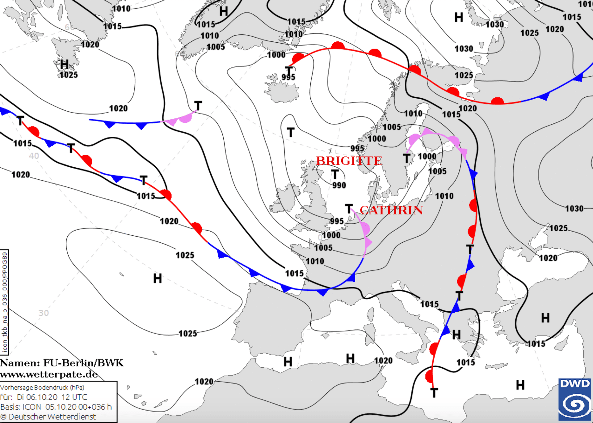 Noms des dépressions et anticyclones prévus pour mardi 6 octobre 2020 à midi (Berlin)