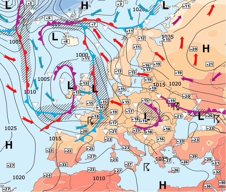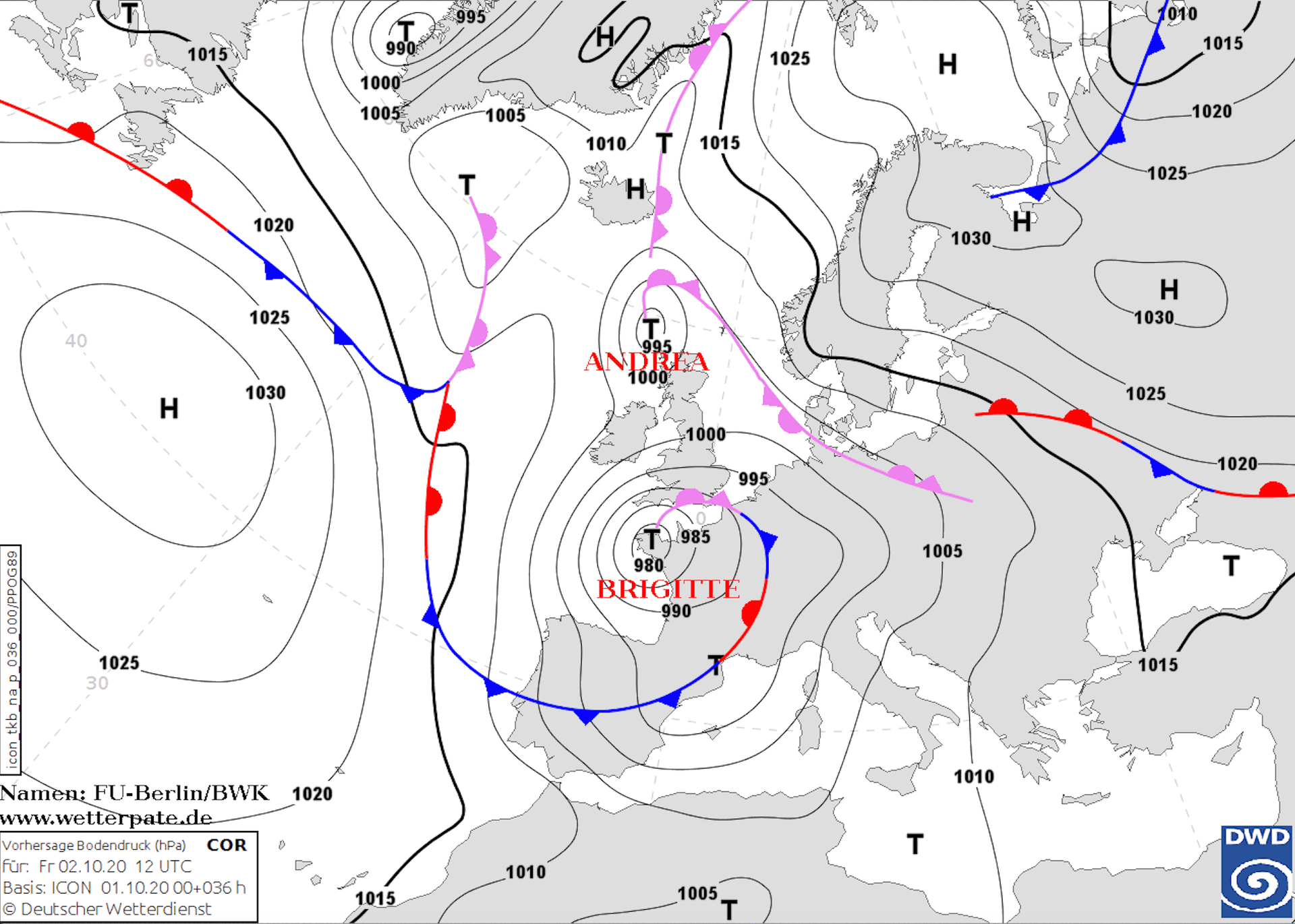 Noms des dépressions et anticyclones prévus pour vendredi 2 octobre 2020 à midi (Berlin)