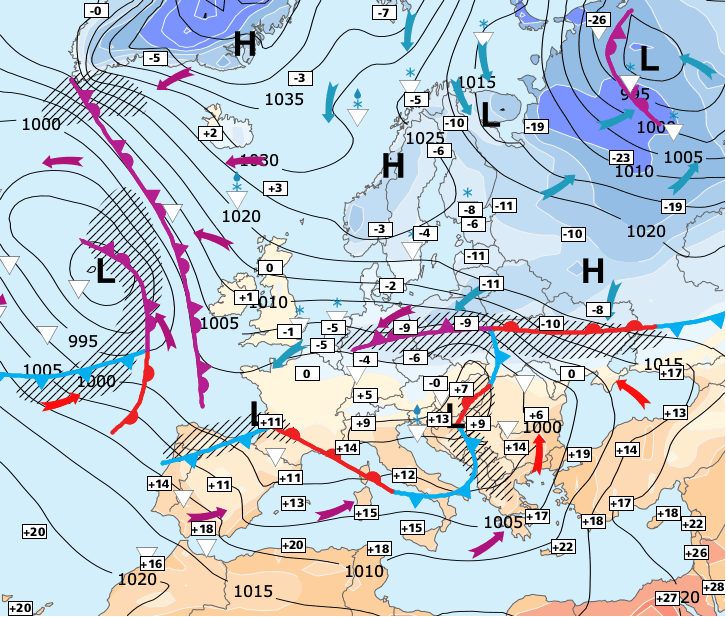 + La perturbation de vendredi circulera beaucoup plus au sud, circulant le Sud-ouest et les régions méditerranéennes.
