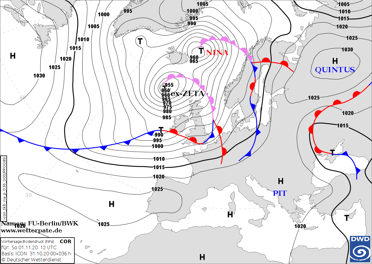 Noms des dépressions et anticyclones prévus pour dimanche 1er novembre 2020 à midi (Berlin)
