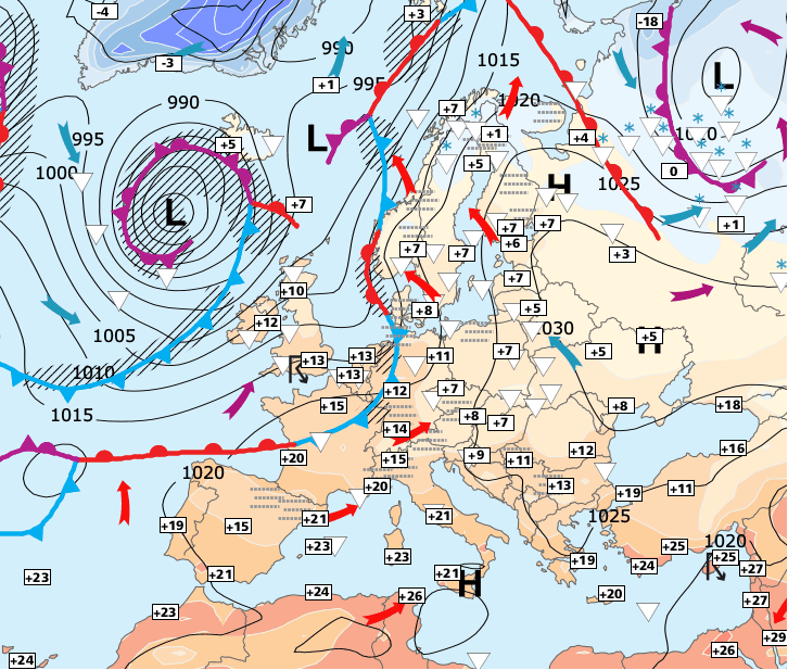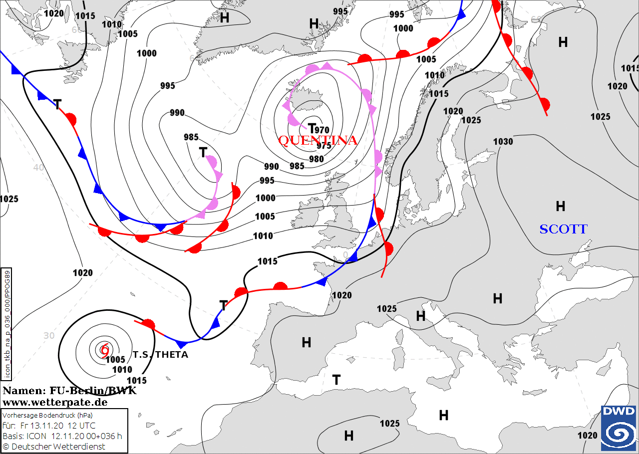 Noms des dépressions et anticyclones prévus pour vendredi 13 novembre 2020 à midi (Berlin)