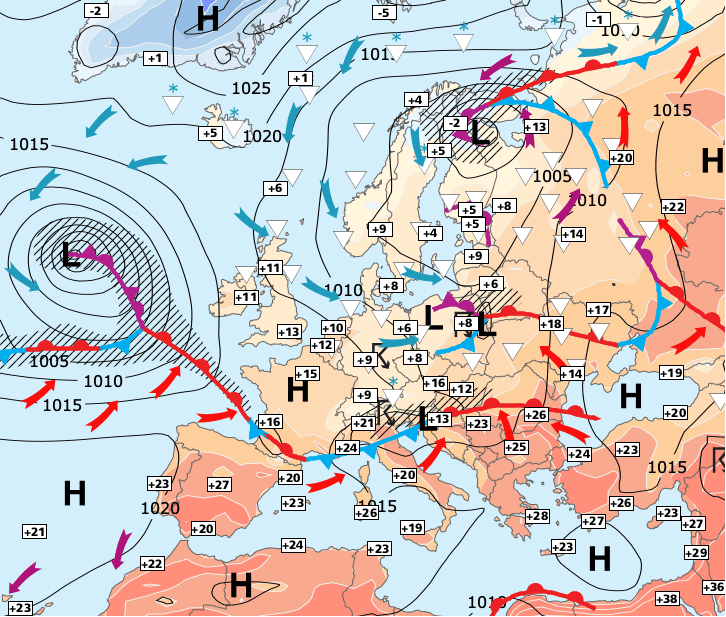 + Le conflit avec l'air plus chaud qui résistera à l'avant provoquera la formation d'une zone d’orages en deuxième partie de journée de dimanche entre les Pyrénées et la Belgique.