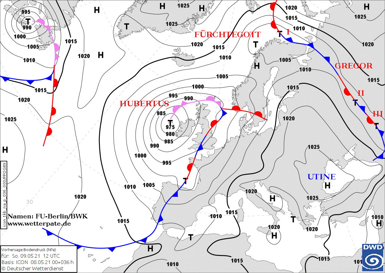 Noms des dépressions et anticyclones prévus pour samedi 8 mai 2021 à midi (Berlin)