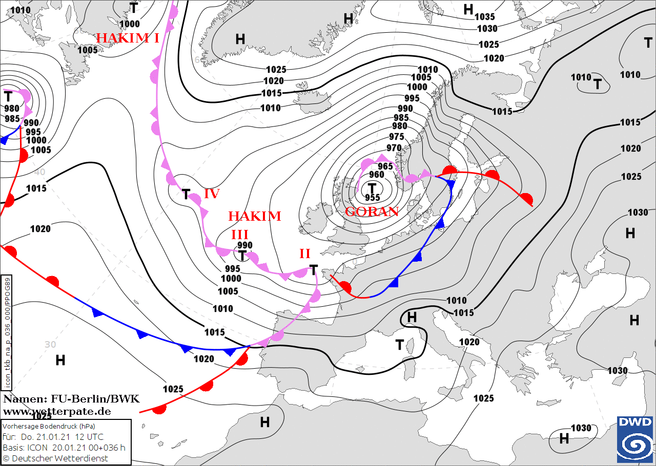 Noms des dépressions et anticyclones prévus pour jeudi 21 janvier 2021 à midi (Berlin)