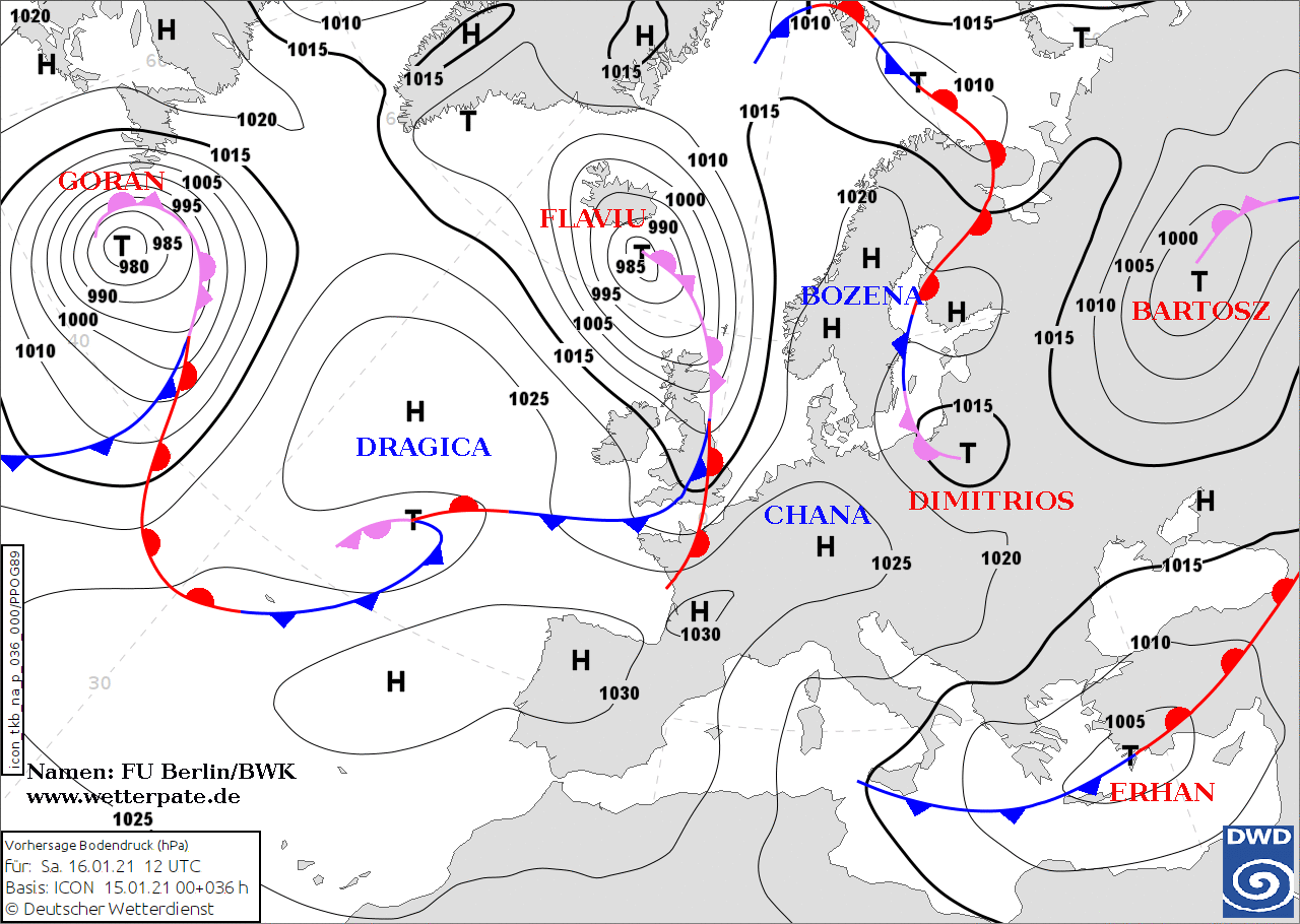 Noms des dépressions et anticyclones prévus pour samedi 16 janvier 2021 à midi (Berlin)