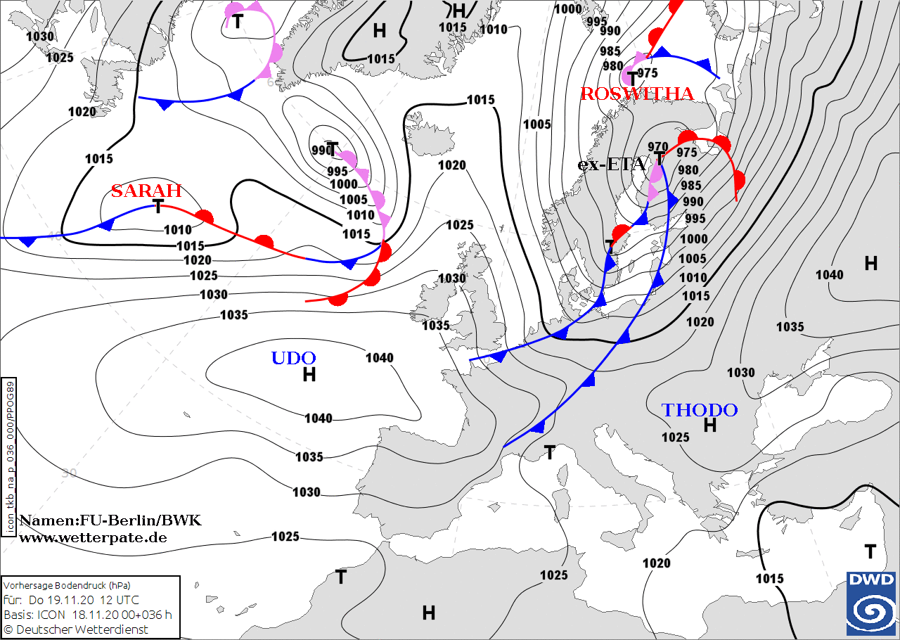 Noms des dépressions et anticyclones prévus pour jeudi 19 novembre 2020 à midi (Berlin)