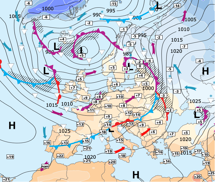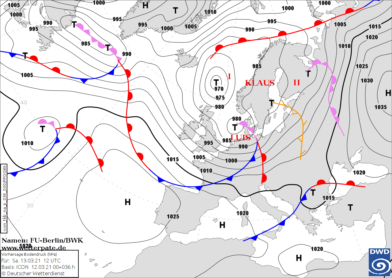 Noms des dépressions et anticyclones prévus pour samedi 13 mars 2021 à midi (Berlin)
