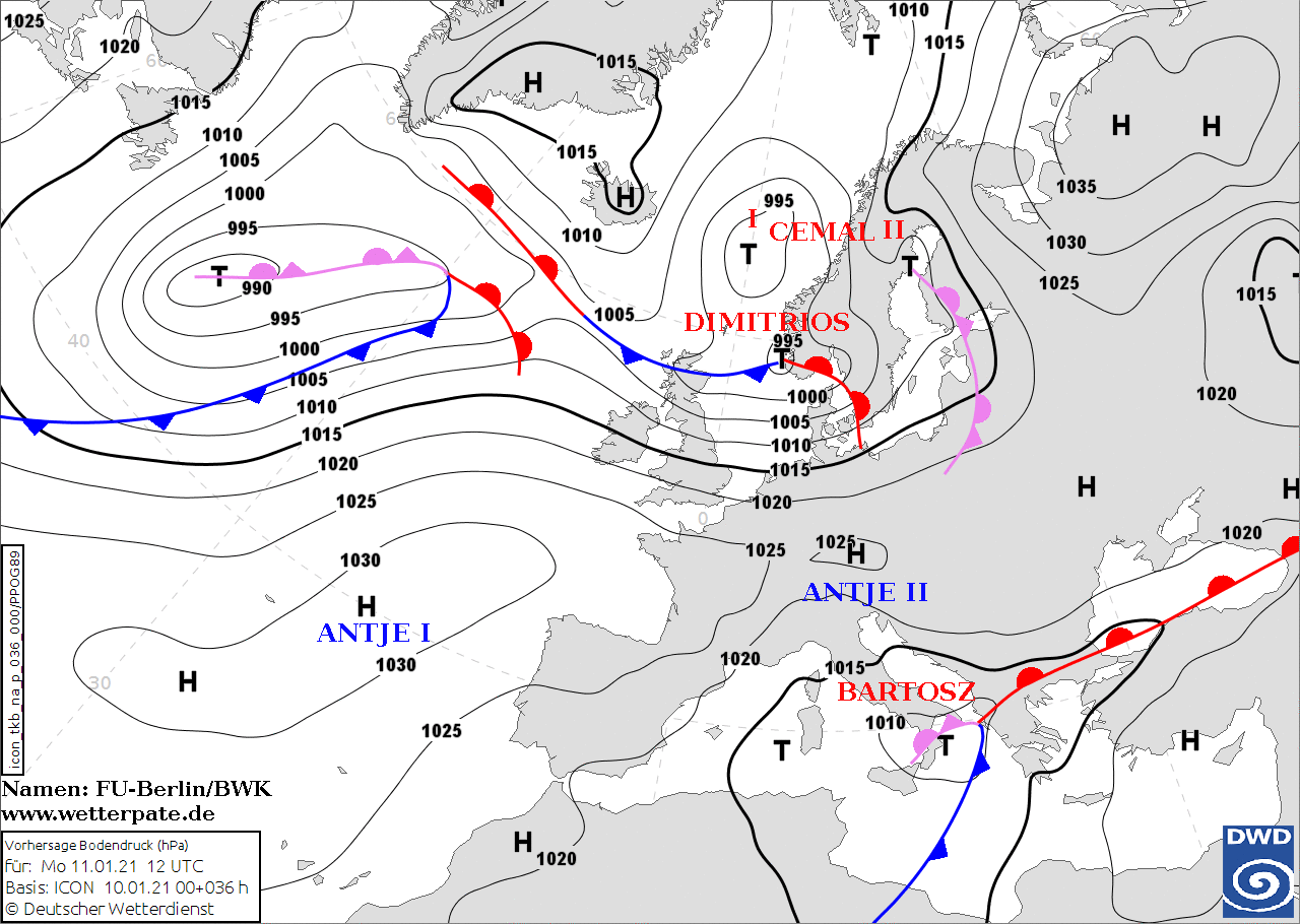 Noms des dépressions et anticyclones prévus pour lundi 11 janvier 2021 à midi (Berlin)