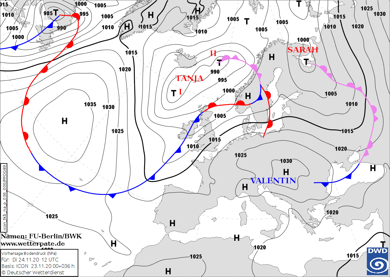 Noms des dépressions et anticyclones prévus pour mardi 24 novembre 2020 à midi (Berlin)
