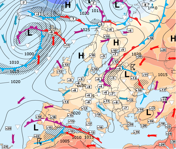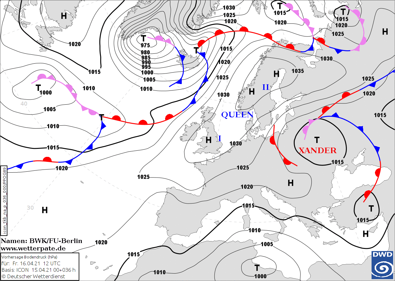 Noms des dépressions et anticyclones prévus pour vendredi 16 avril 2021 à midi (Berlin)