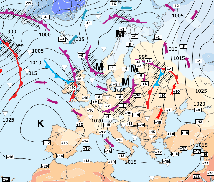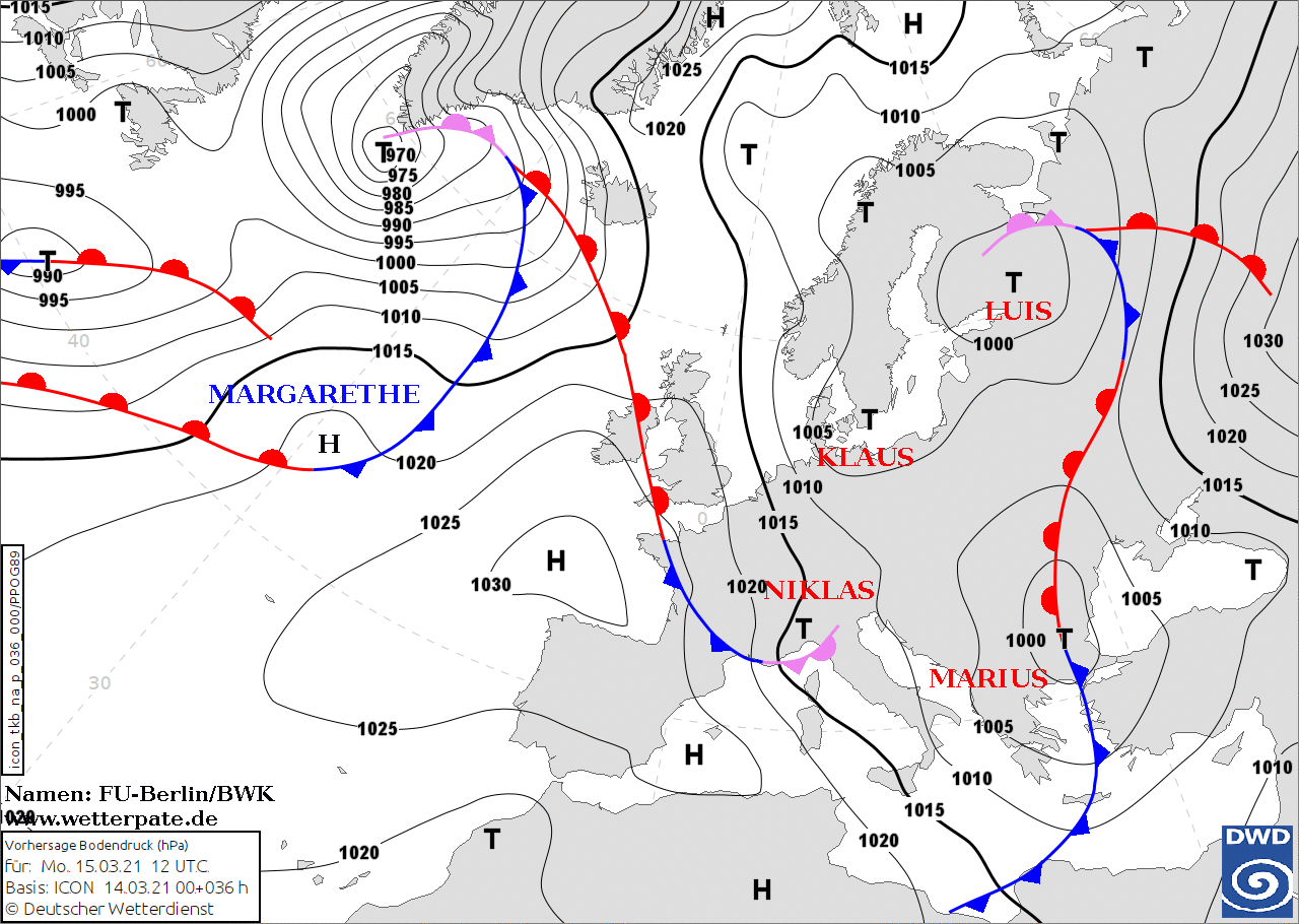 Noms des dépressions et anticyclones prévus pour lundi 15 mars 2021 à midi (Berlin)
