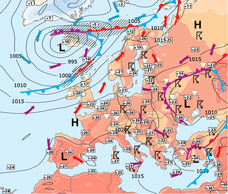 Noms des dépressions et anticyclones prévus pour vendredi 11 juin 2021 à midi (Berlin)