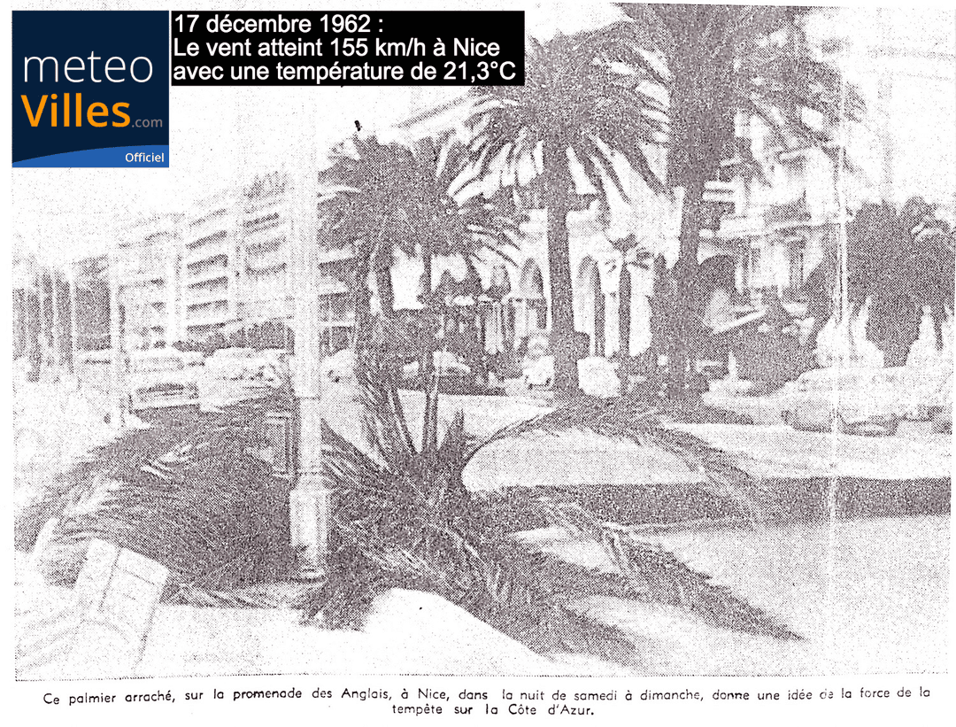 Le 17 décembre 1962, dans les régions méditerranéennes, le temps est exceptionnellement doux et sec (effet de fœhn) A Nice, la température maximale de la journée atteint 21,3°C et jusqu'à 28,0°C à Sospel (frontière italienne !) alors qu'au même moment, la température moyenne de la journée est de -3°C au sommet du Mont Ventoux.