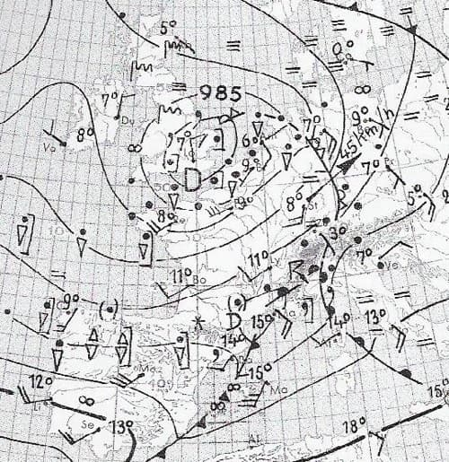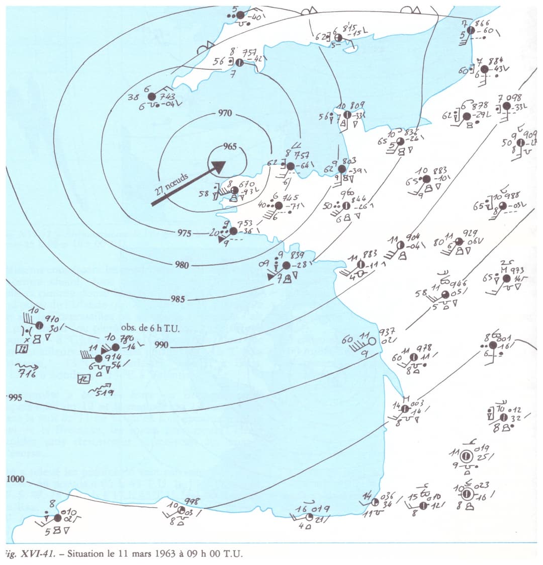 Analyse du 11 mars 1963 à 9h00 TU - Carte issue de l'ouvrage "Météorologie Marine" R. Mayençon