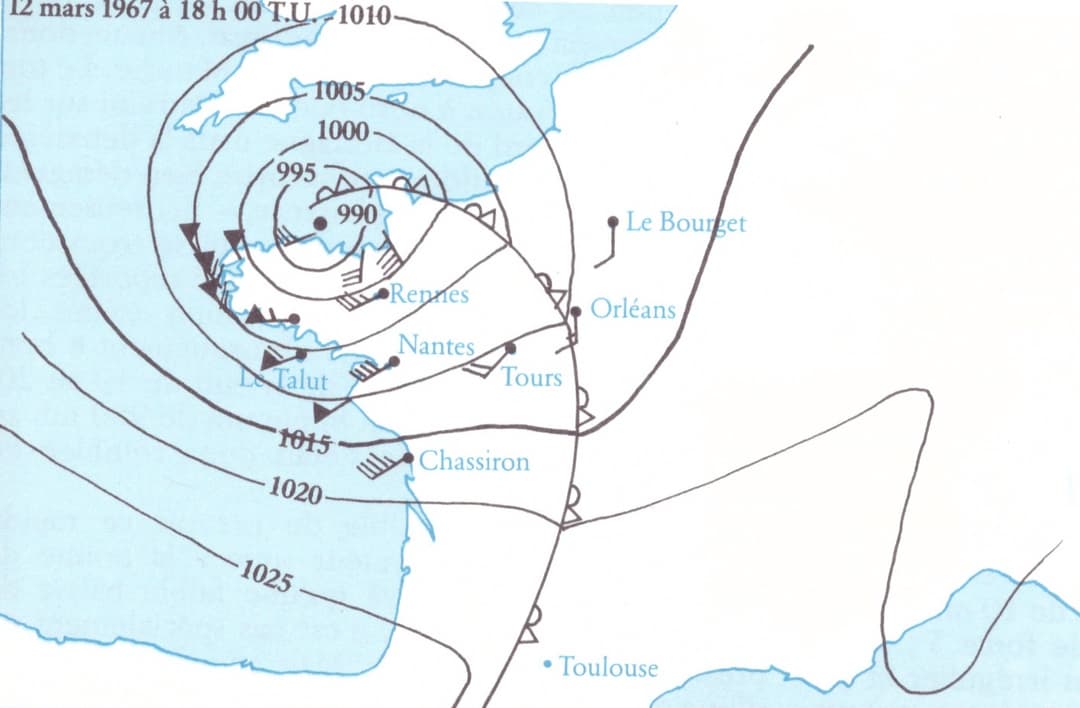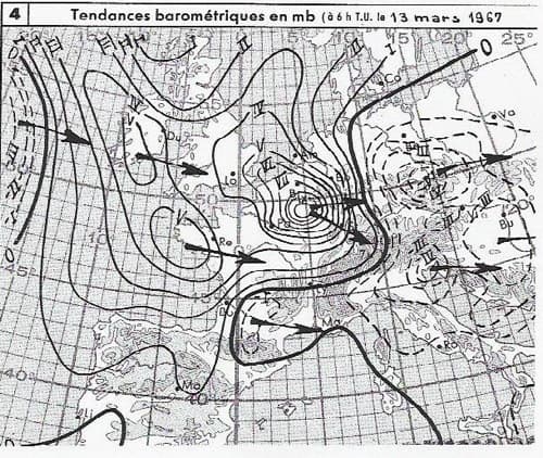 Analyse météo du 12 mars 1963 à 18h TU - Carte issue de l'ouvrage "Météorologie Marine" R. Mayençon