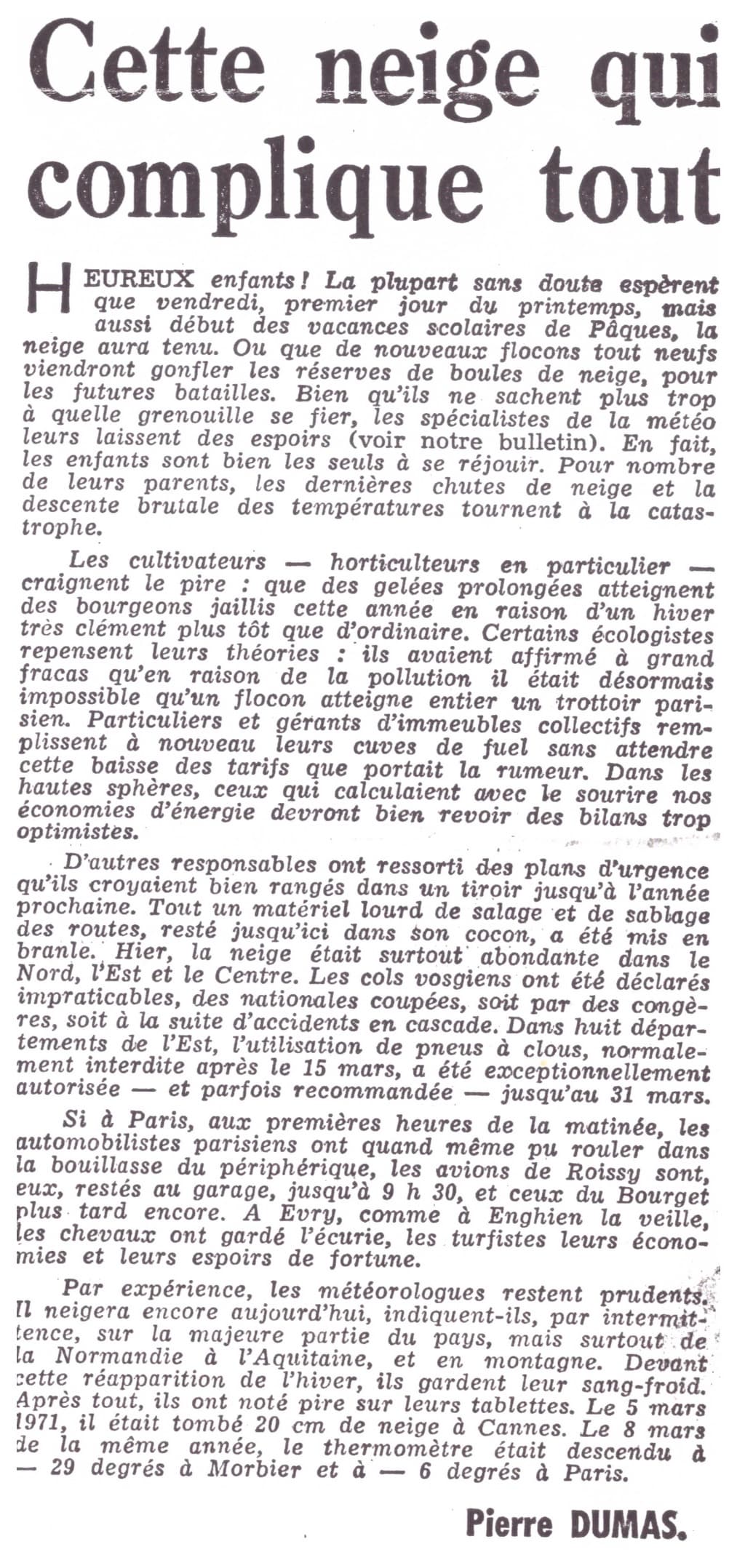 Neige du 19 mars 1975 - édito de journal l'Aurore du 20 mars 1975