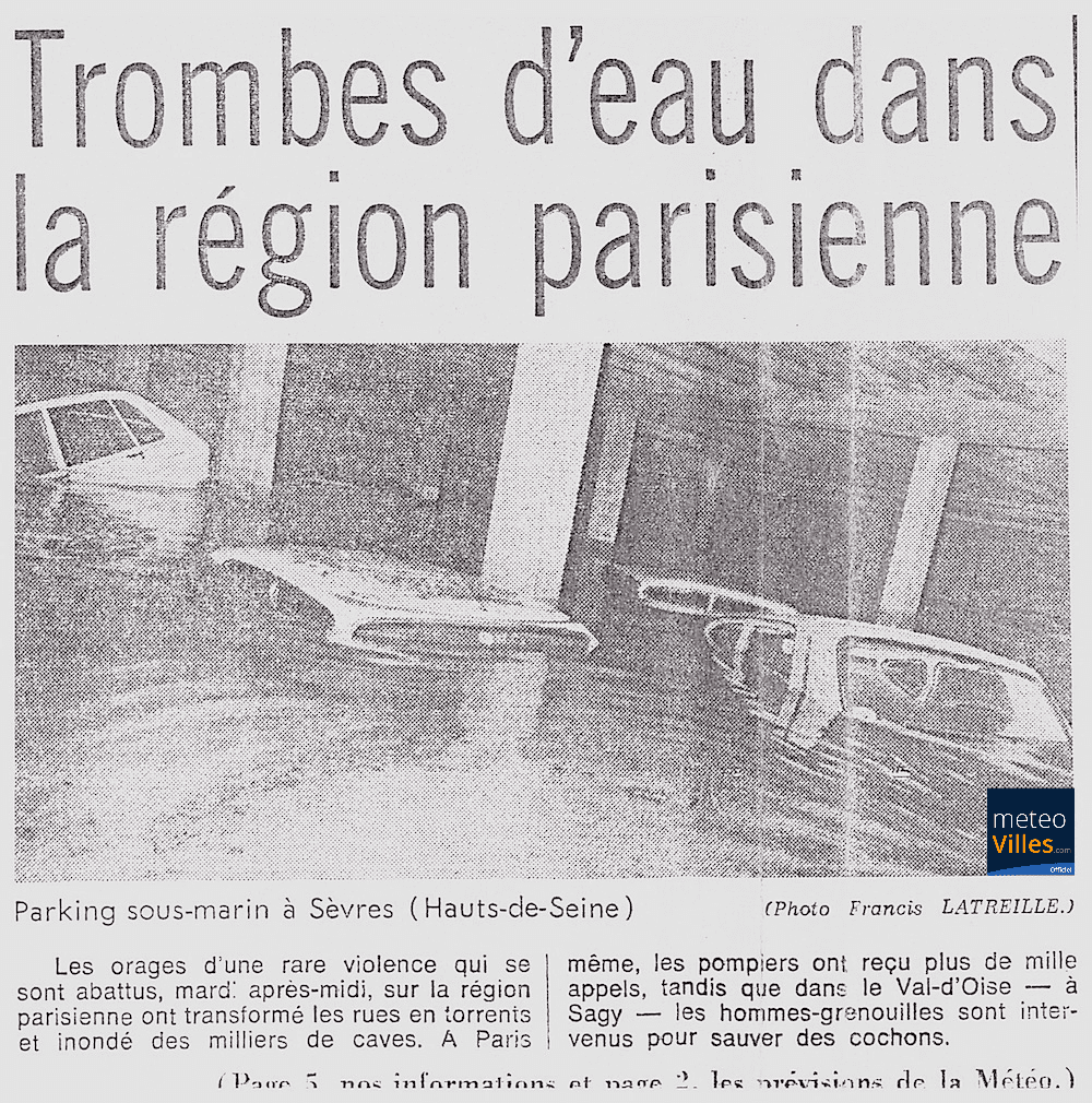 Dans la nuit du 7 au 8 juillet 1975 : des orages particulièrement violents éclatent dans le Nord-ouest - trombes d’eau en région Parisienne où des parking souterrains sont totalement noyés - rafales à 148 km/h au Mans à 23h25 ainsi que 21mm de pluie en Ih30 - une tornade est signalées dans le Finistère (région de Lanrivaré) - 5 fermes sont soufflées et un tracteur est projeté à plusieurs centaines de mètres.