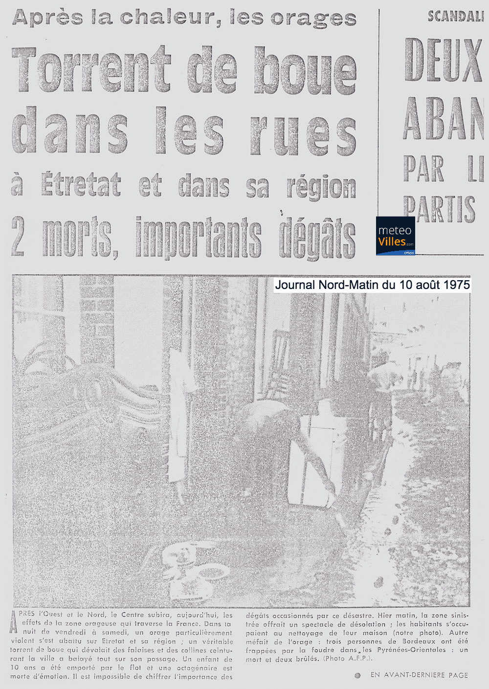 La une du journal Nord-Matin du 10 août 1975 après l'orage à l'origine du torrent de boue meurtrier du 8 août 1975