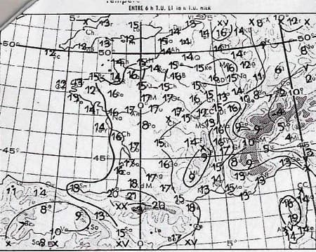 Météo hivernale de la mi-octobre 1975, lorsque le temps devient également plus humide - Températures maximales du 13 octobre 1975 - neige à Chateau-Chinon, sur les plateaux Lorrains et Fran-comtois
