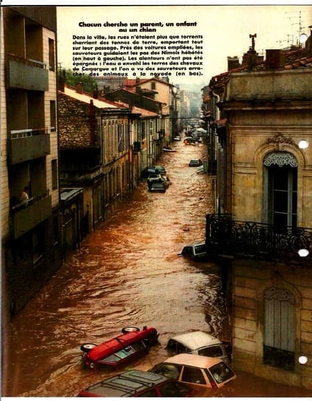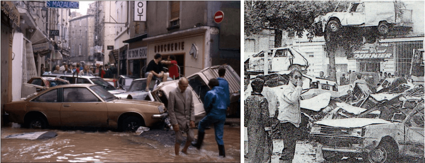 3 octobre 1988 : une catastrophe se produit à Nîmes - un terrible orage stationne sur la région pendant quelques heures et un torrent d’eau et de boue descend brutalement des hauteurs de la ville, submergeant en quelques minutes les bas quartiers de la ville - cette catastrophe se produit au moment même où une partie de la population se rend à son travail - des personnes sont donc prises au piège dans leur véhicule et 10 d’entre elles sont emportées et noyées par le courant - au cours de cet orage historique, il tombe 420 mm d’eau sur les hauteurs de la ville, soient un peu plus de ce qu’il tombe en 6 mois dans ce secteur.