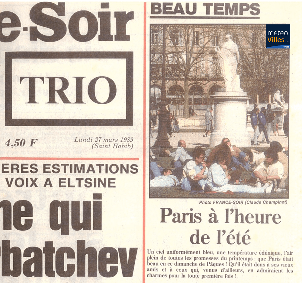 Du 26 au 31 mars 1989 : la chaleur devient tout à fait remarquable - on enregistre 28° à Biarritz, 27° à Cazaux, 26° à Strasbourg, 25° à Lyon et 24° à Paris - après un hiver déjà très doux, la végétation prend pratiquement un mois d’avance.