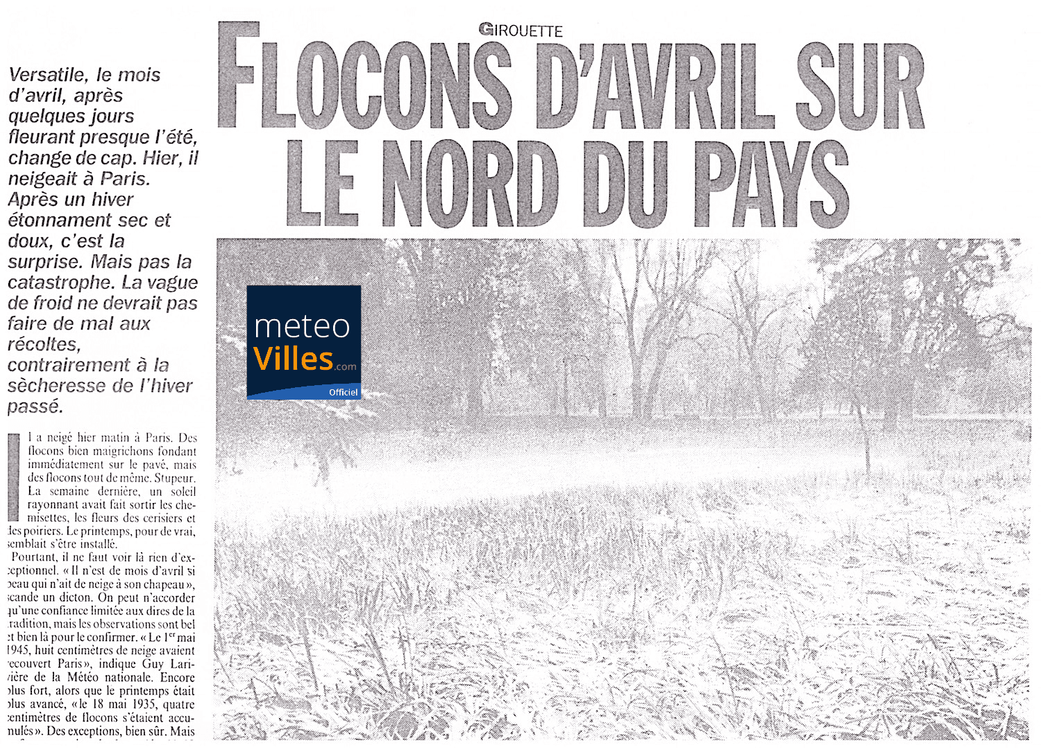 4 avril 1989 : ce n’est pas un canular mais il neige toute la journée de la Bretagne à la Belgique - il s’agit des premières neiges depuis le mois de novembre, et dans certains cas, depuis l’hiver 1987-1988 ! on mesure 4cm en région parisienne.