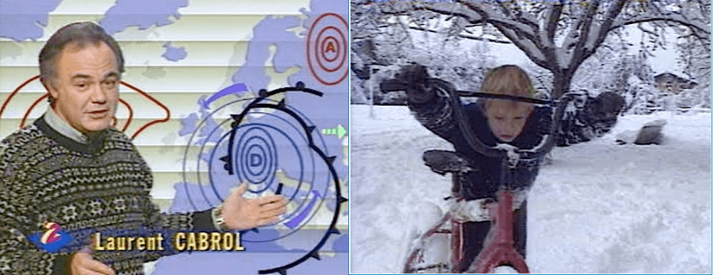Neige record de décembre 1990 en région Rhône-Alpes : Laurent Cabrol expliquant cette situation exceptionnelle sur Antenne 2 - à droite : La neige fait également des heureux