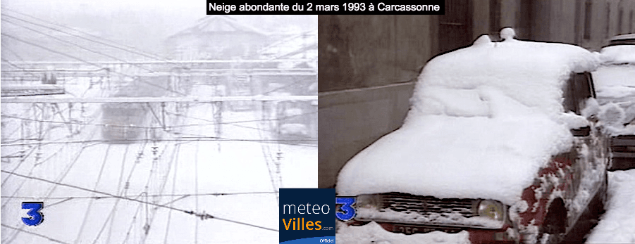 2 mars 1993 : court épisode neigeux en région Midi-Pyrénées et sur le Languedoc-Roussillon - 22cm de neige à Carcassonne, 12cm à Narbonne, 10cm à Toulouse, 5cm sur la plage du Cannet.
