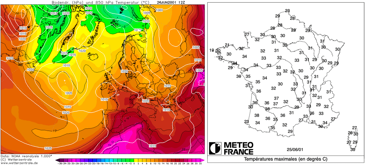 Les 25 et 26 août 2001: chaleur accablante sur toute la France - maximums de 36° à Rennes, Poitiers, Auxerre et dans le Calvados, 35° à Paris, Alençon et Evreux.