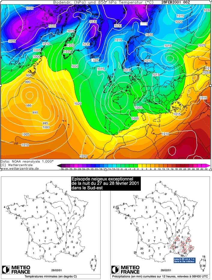 Du 24 février au 4 mars 2001 : première « offensive » hivernale depuis novembre 1999, dans le sud-est - le 26 février 2001, d’abondantes chutes de neige collante recouvrent le Var et la Corse - on mesure 15 cm à Canjuers (Var), 20 cm à Bocognano et 41 cm à Evisa (Corse) - le 27 février 2001, les chutes de neige sont encore plus importantes - elles paralysent toute la Provence et la Corse intérieures, ainsi que l’Ardèche et les Cévennes - on mesure jusqu’à 80 cm à St-Maximin (Var) 65 cm à Sault (Vaucluse) et 52 cm à Régusse (Var) - les dégâts sont énormes - plus de 100 000 foyers sont privés d’électricité et des milliers d’automobilistes sont bloqués sur routes et autoroutes.